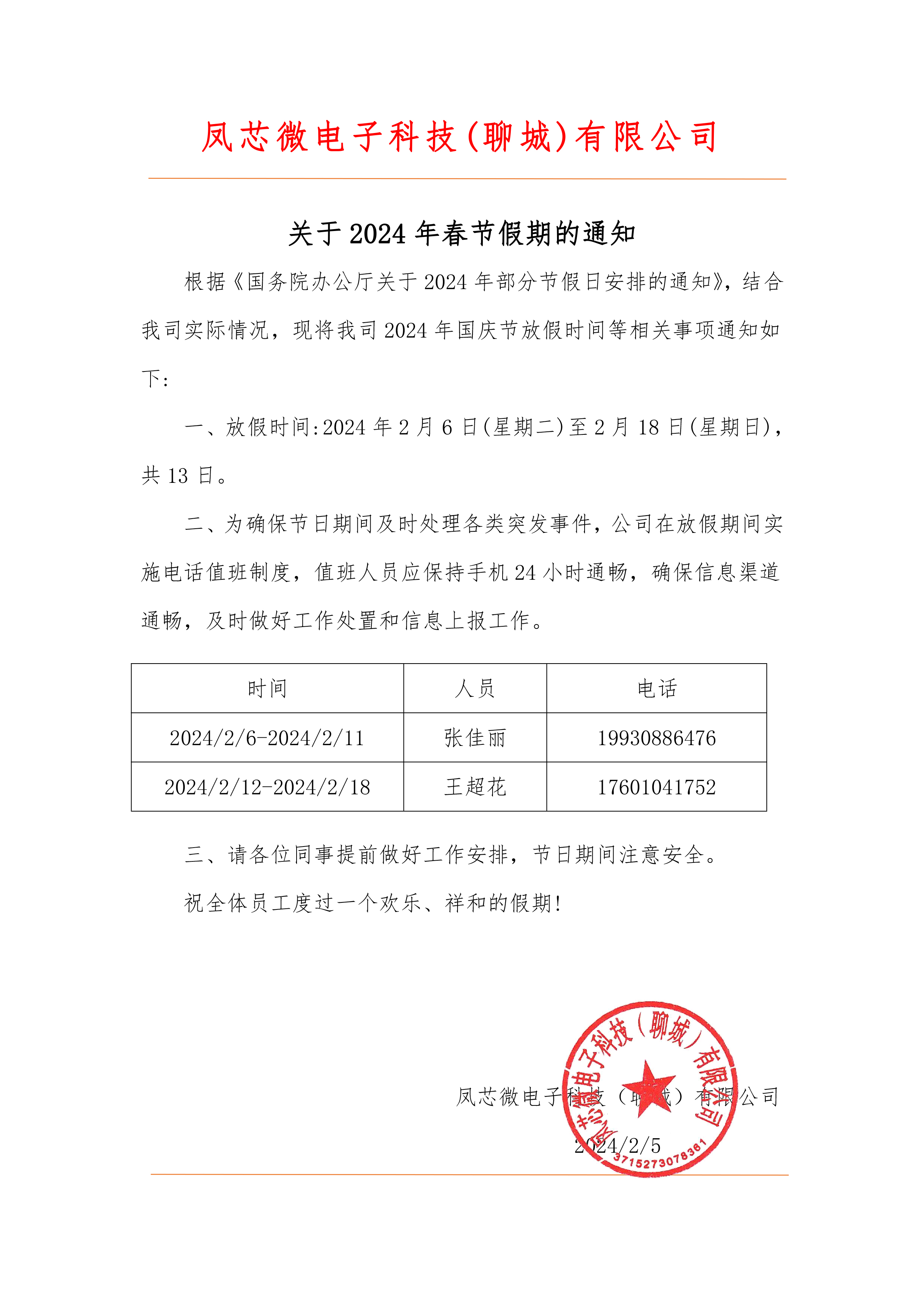 凤芯微电子科技(聊城)有限公司2025年春节放假通知